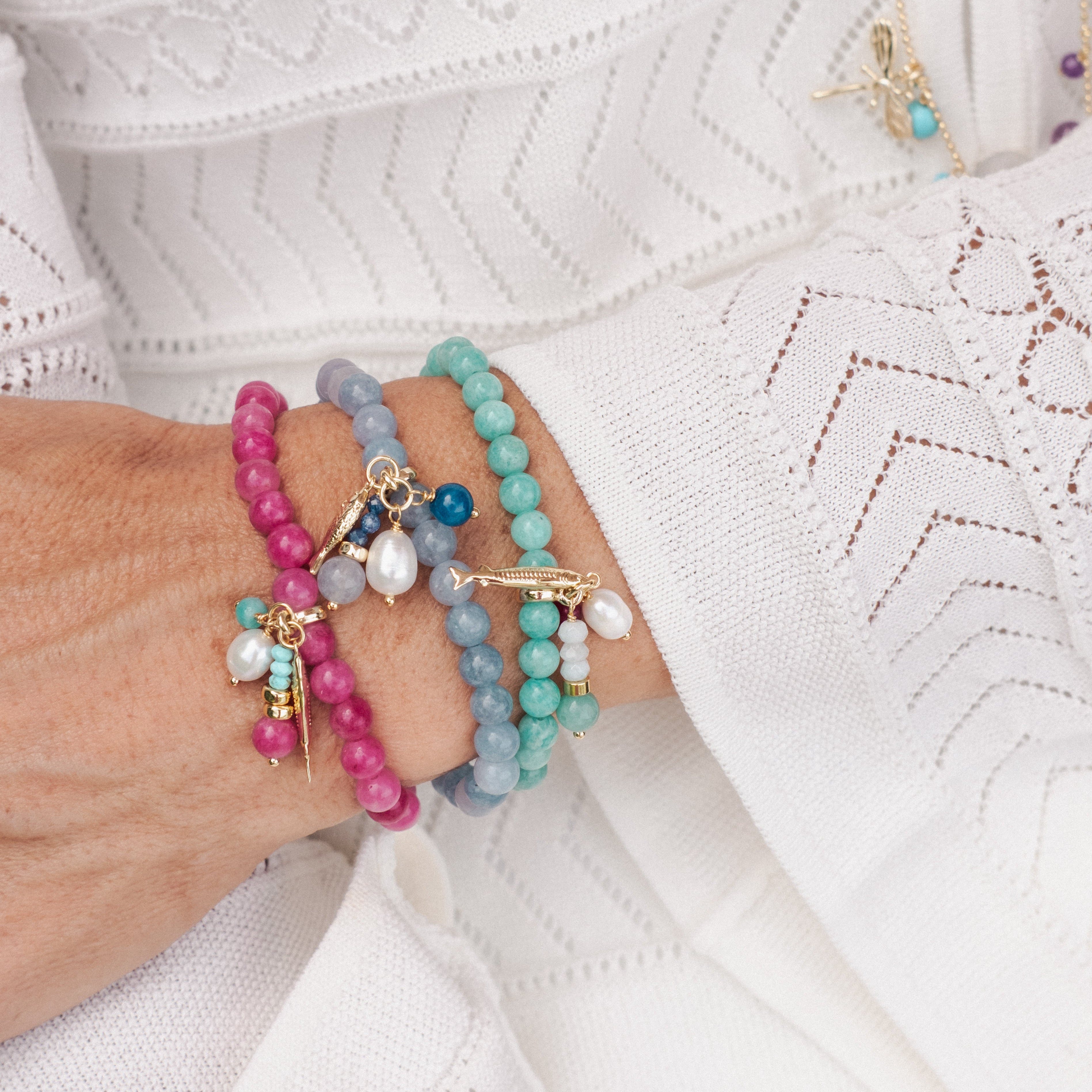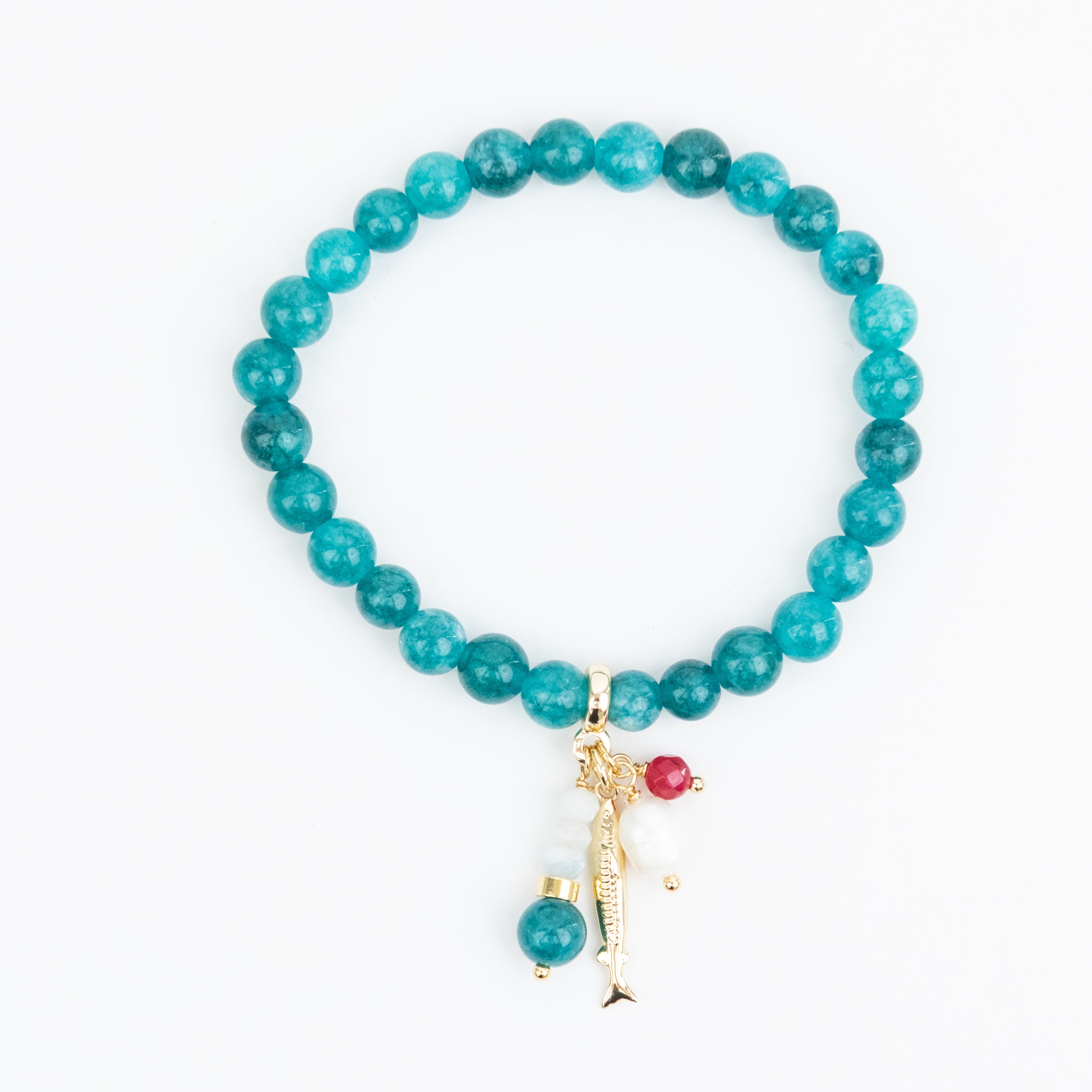 Sea Green Agate stretch Bracelet with charms of Gold Plated Charms, Pearls and Semi Precious stones.