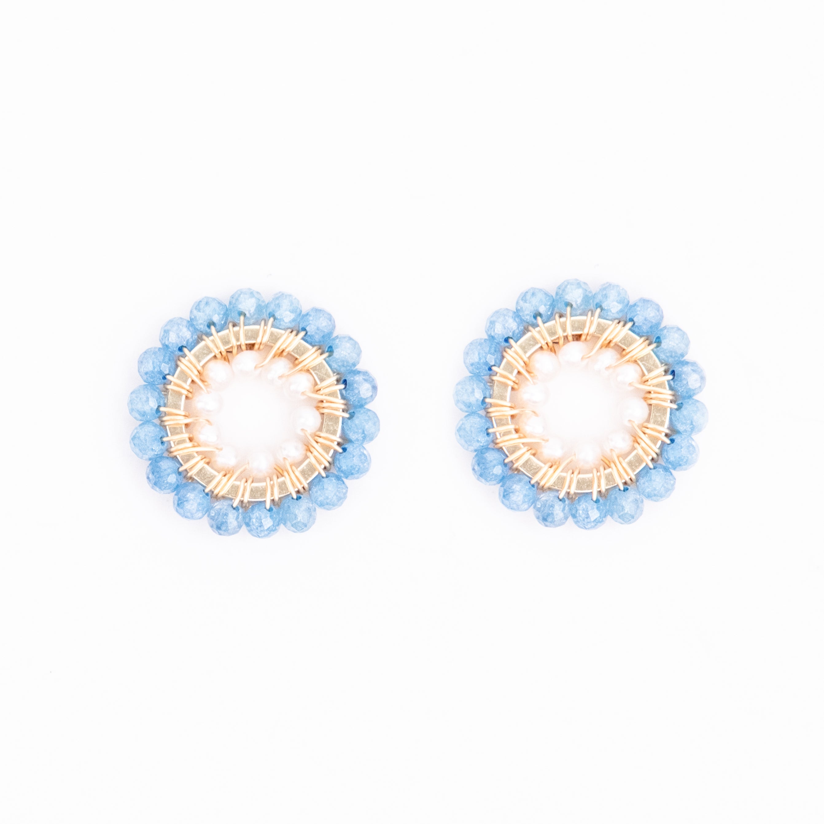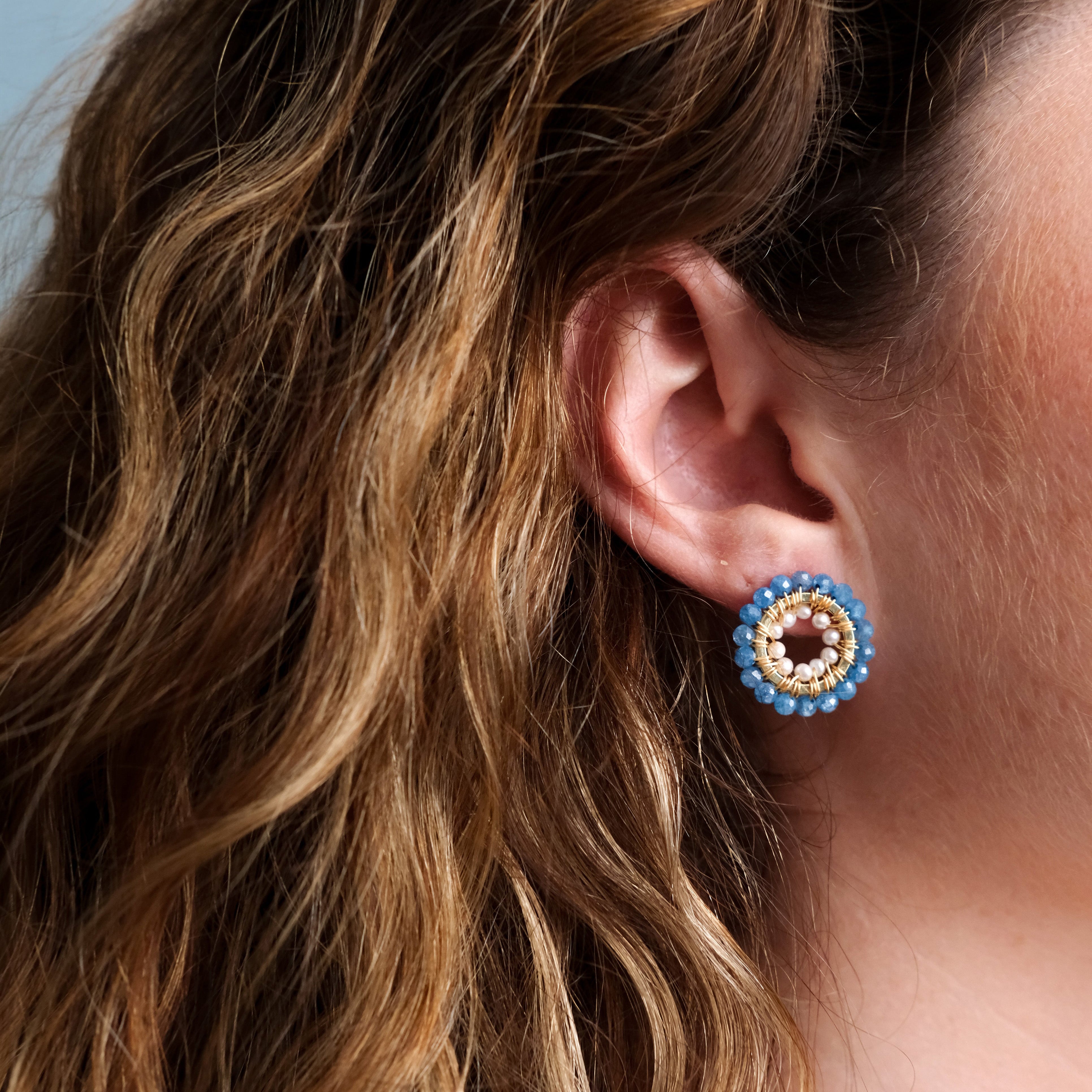 Double Wrapped Studs with Cornflower Jade and Fresh Water Pearls.