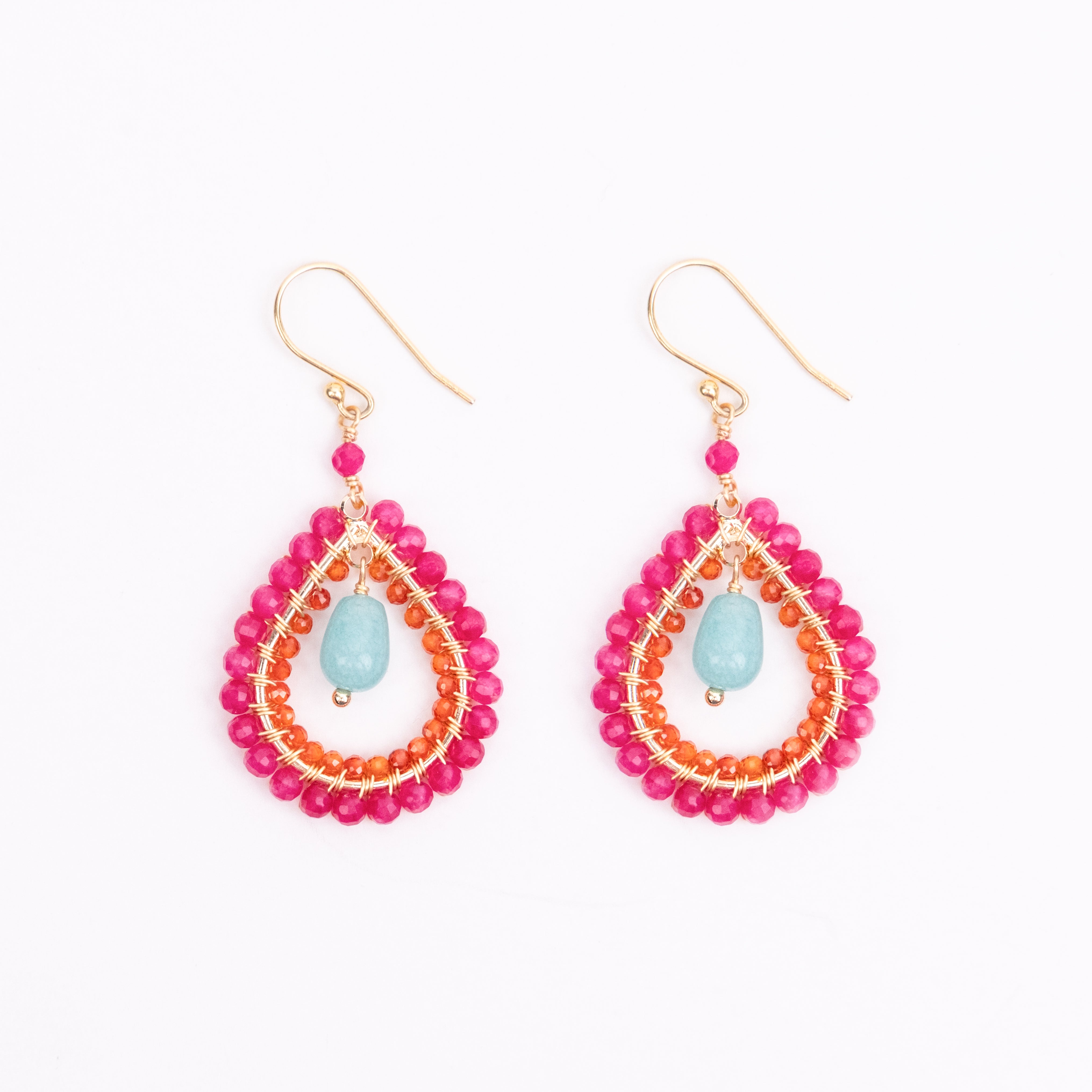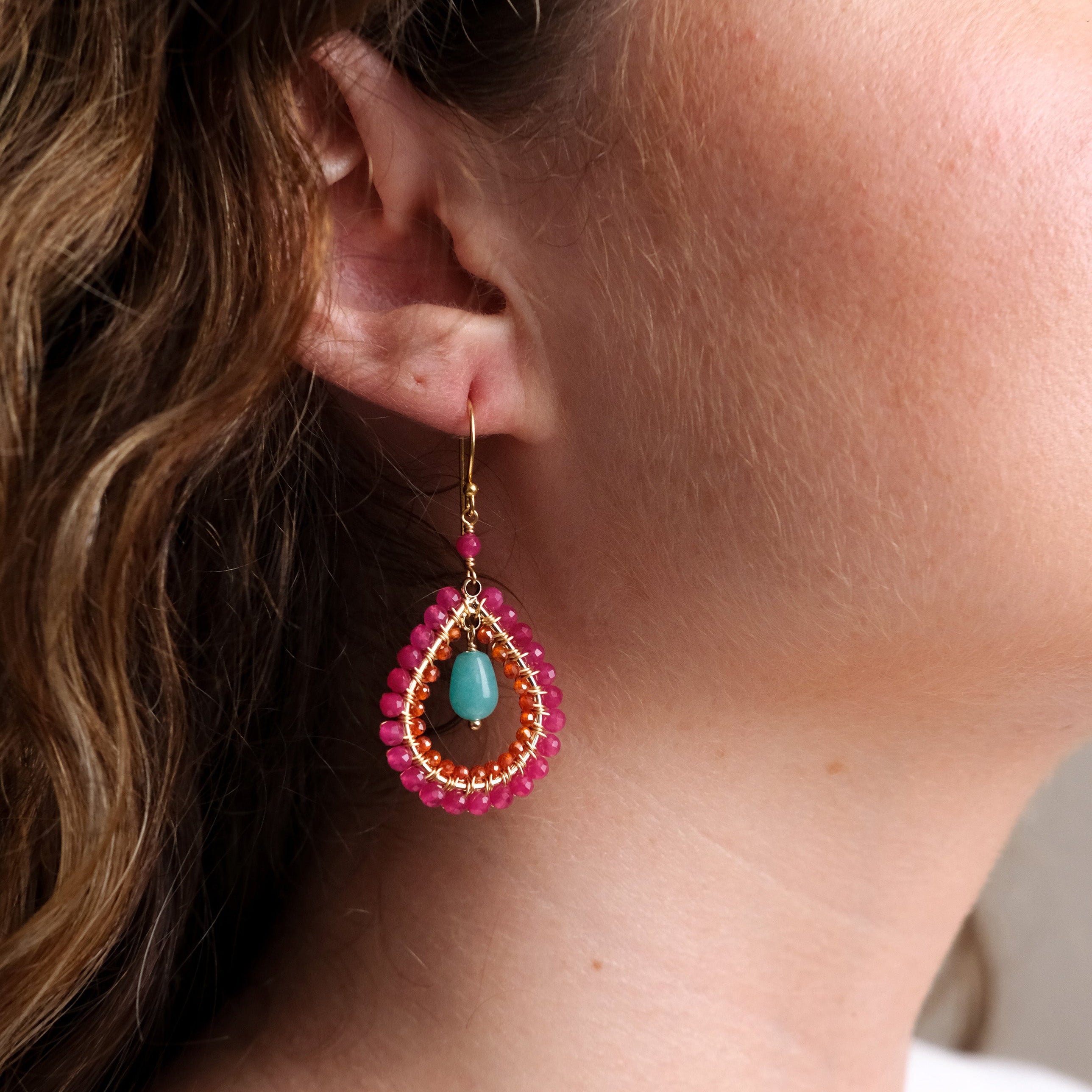 Fuchsia Pink Jade with Carnelian and finished with an Amanzonite drop