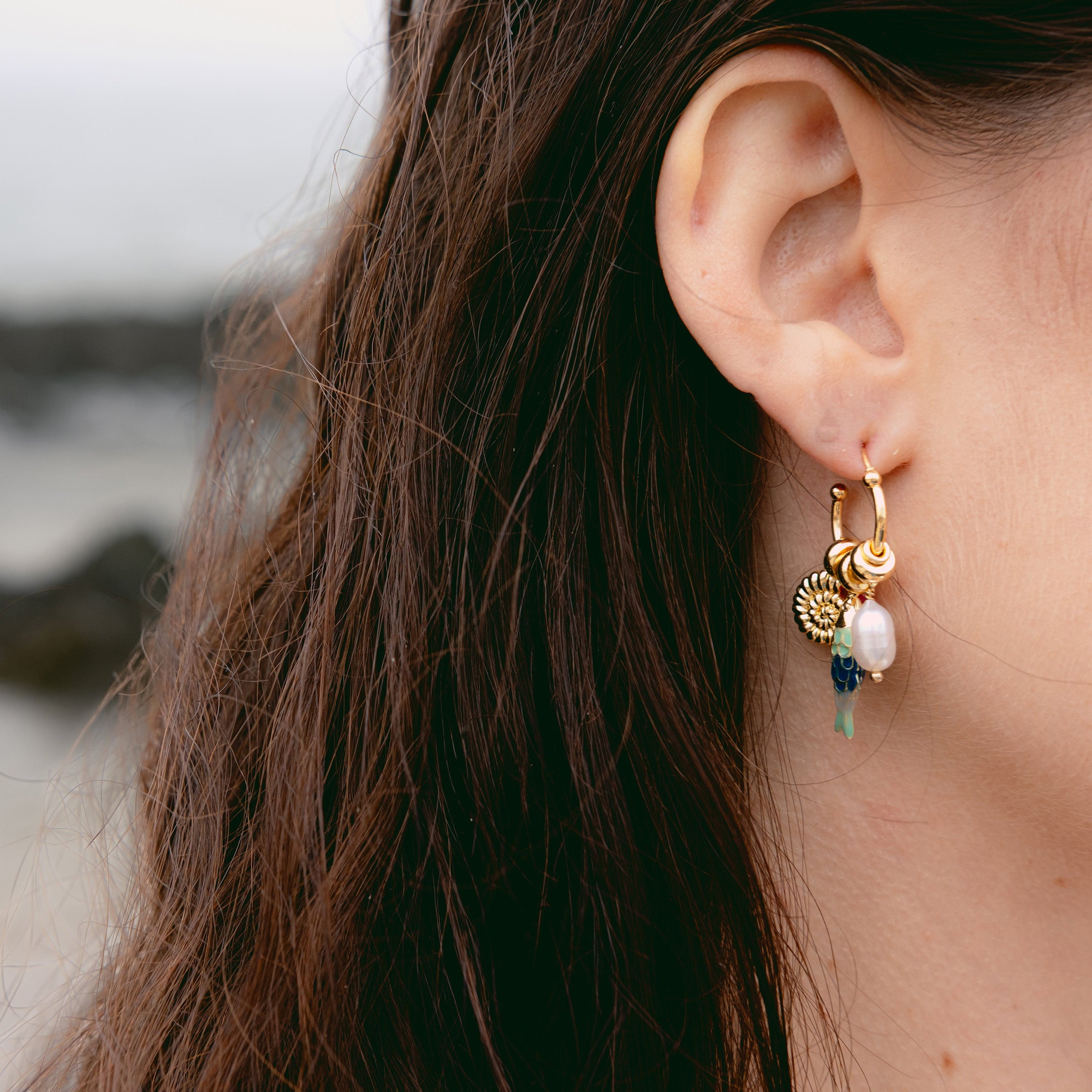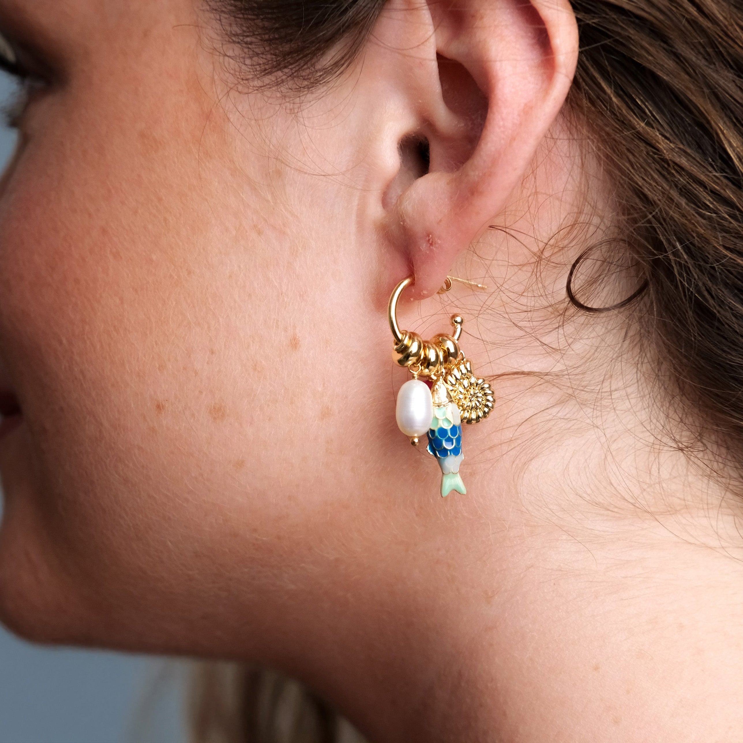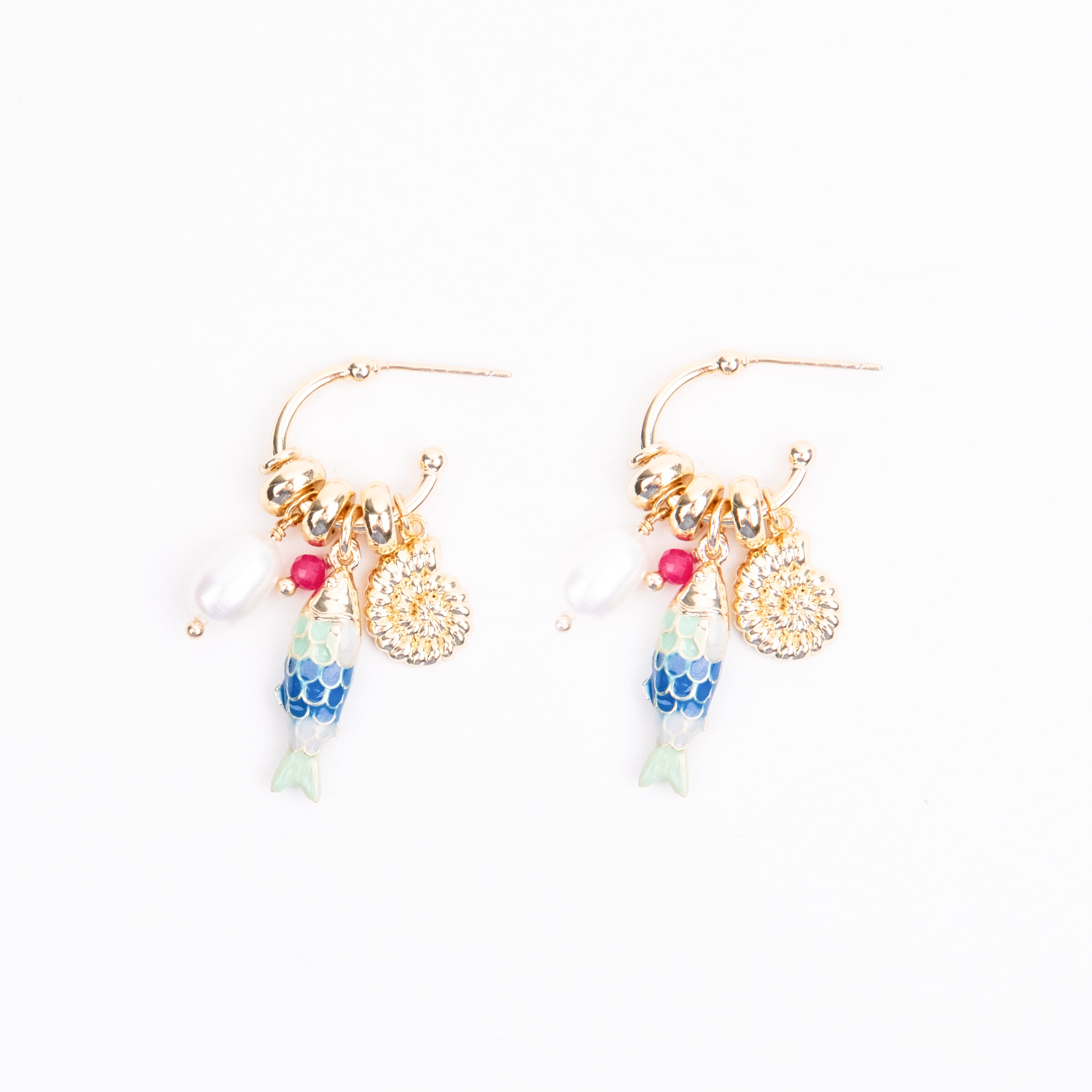 Gold Plated Forward Facing Hoops with Enamel Fish Charm, Fresh water Pearl and Charms