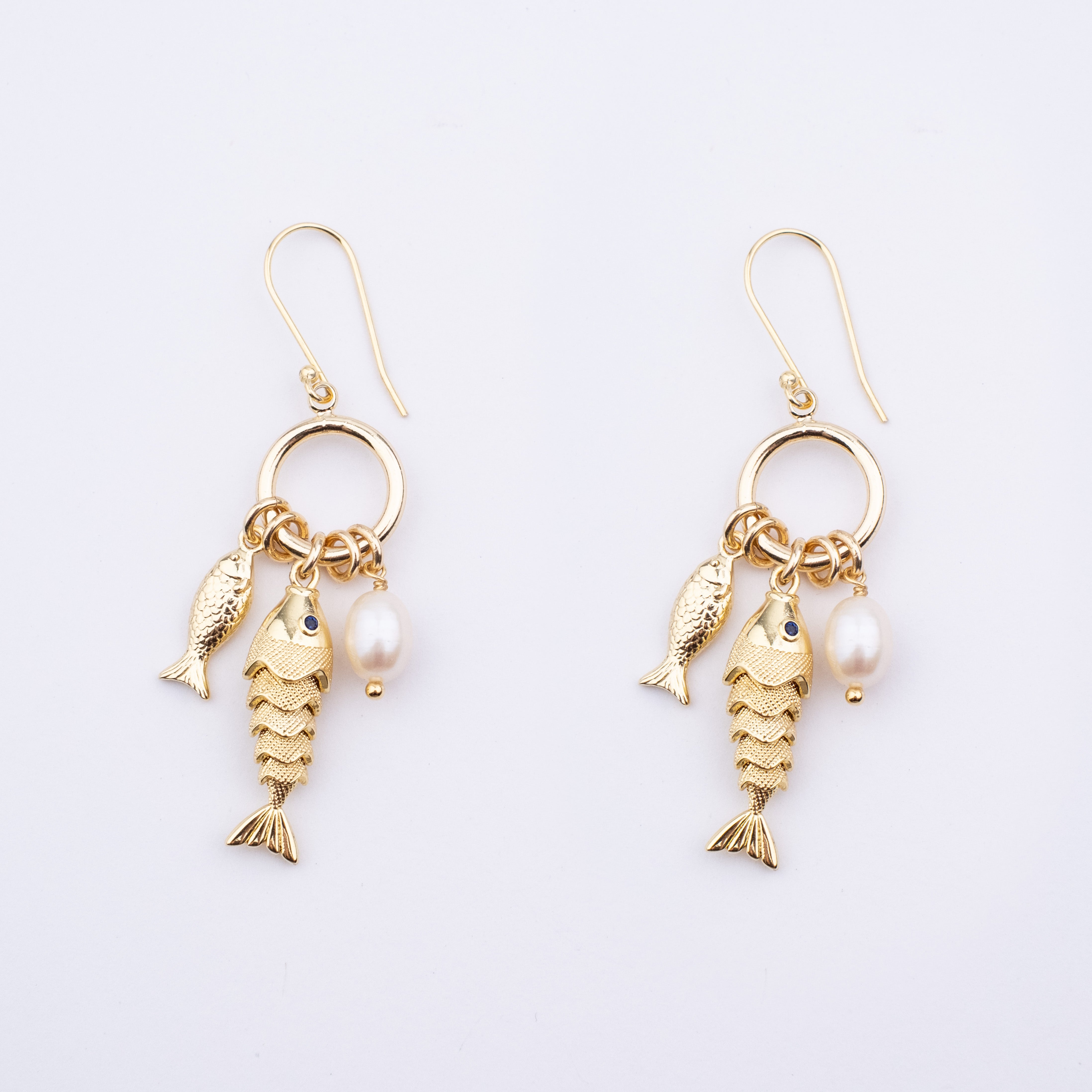 Forward Hoop earrings with a Gold Plated Articulated Fish, Fish Charm and Freshwater pearl