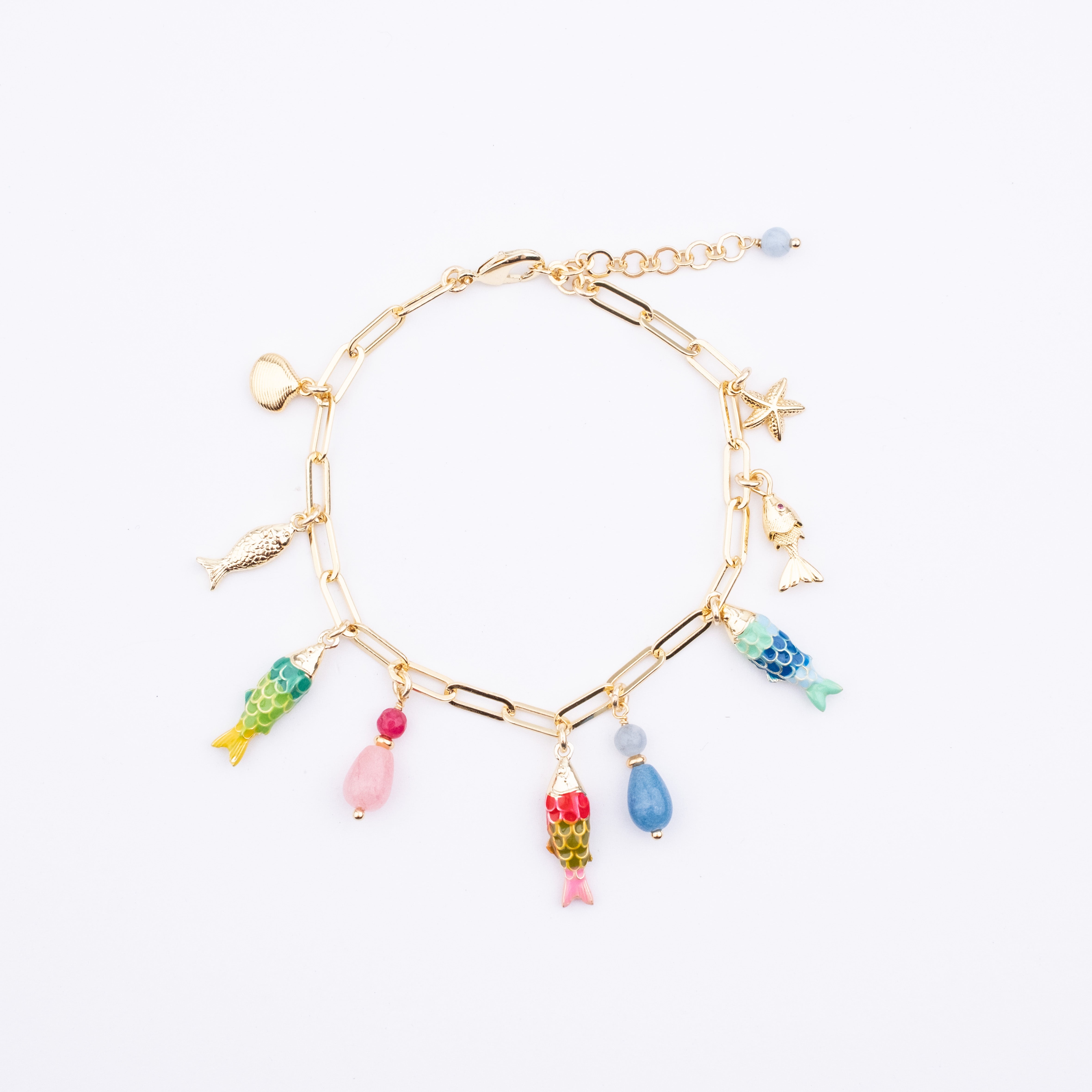 Bracelet with Multicolour Enamel Fish Charms, Semi Precious Stones and Gold Plated Charms.