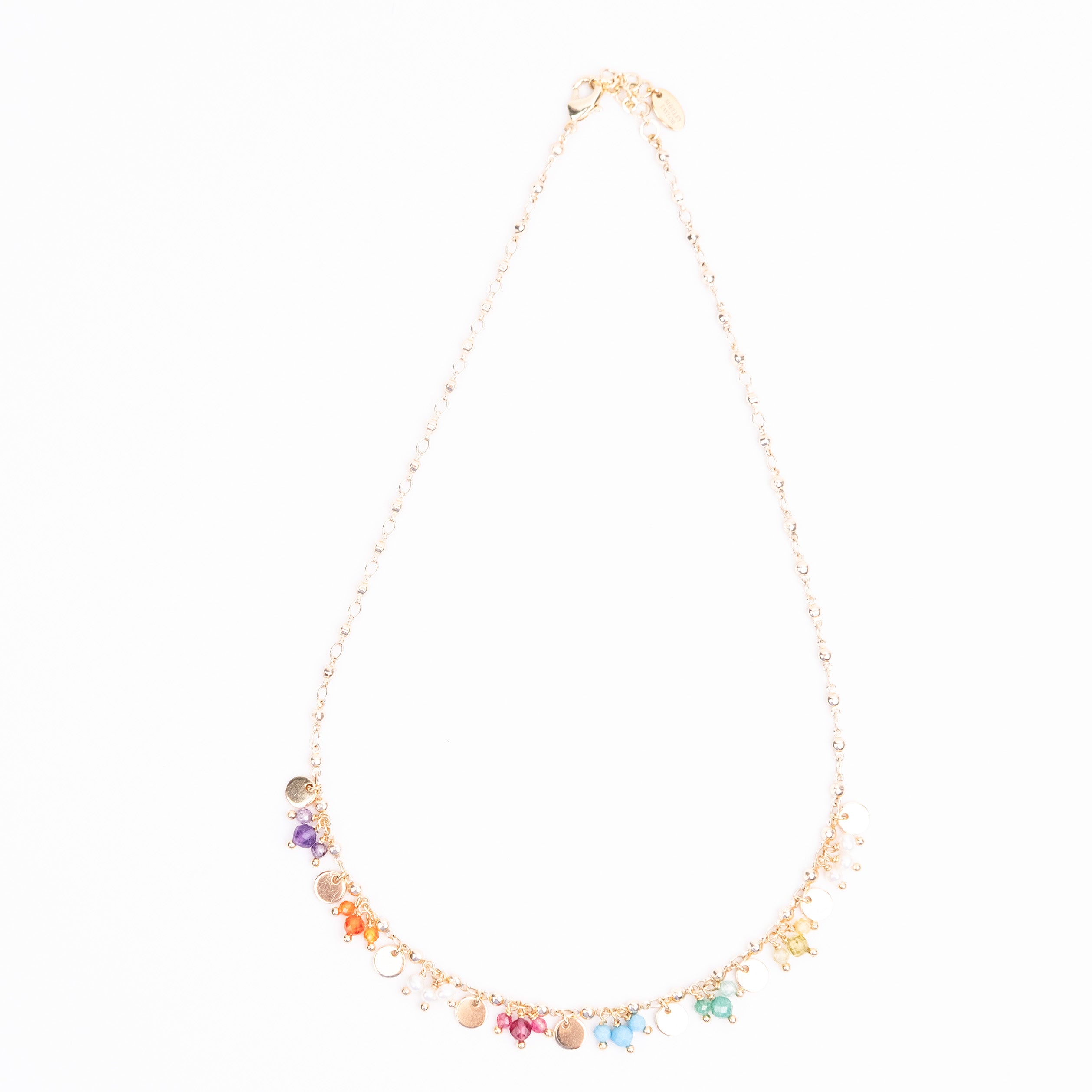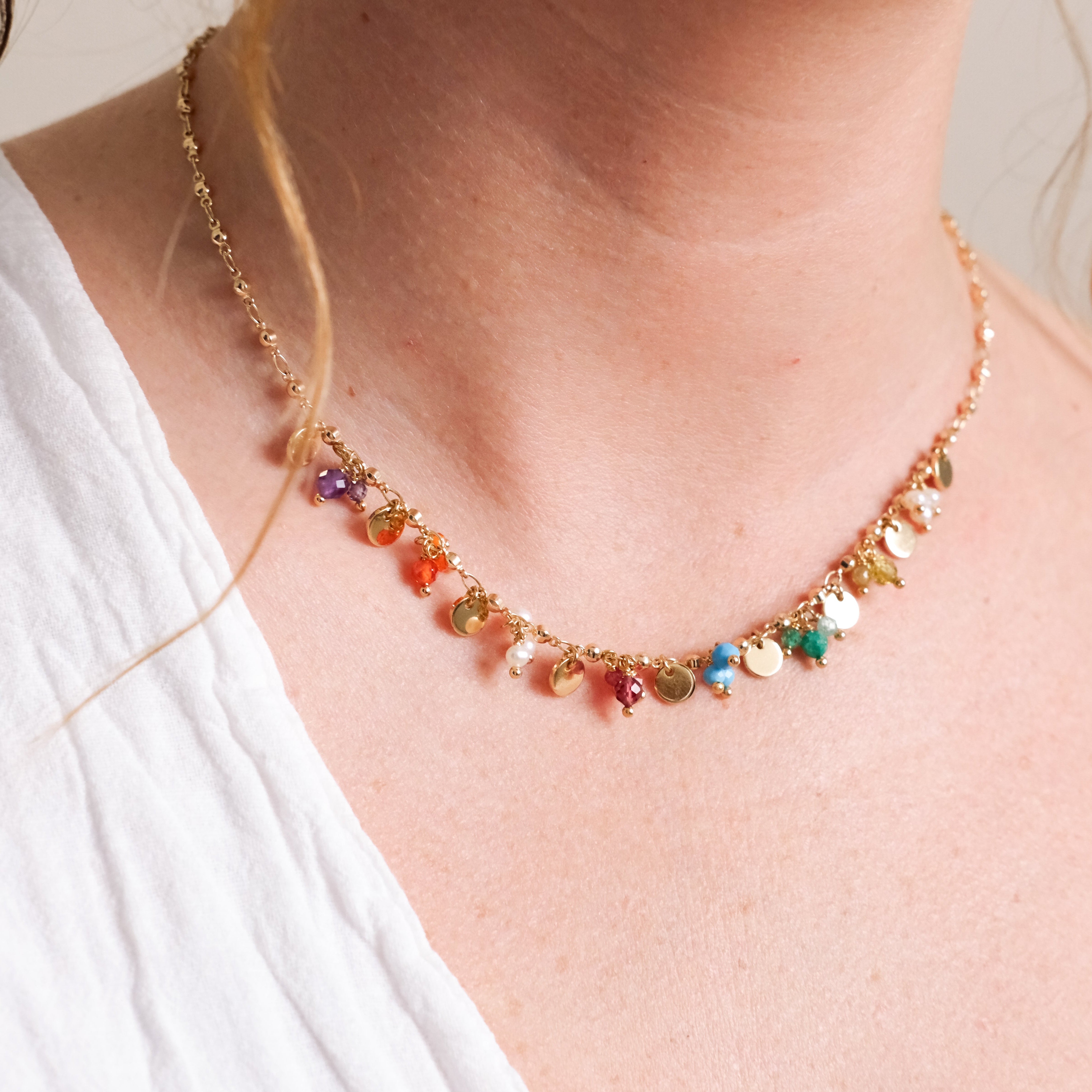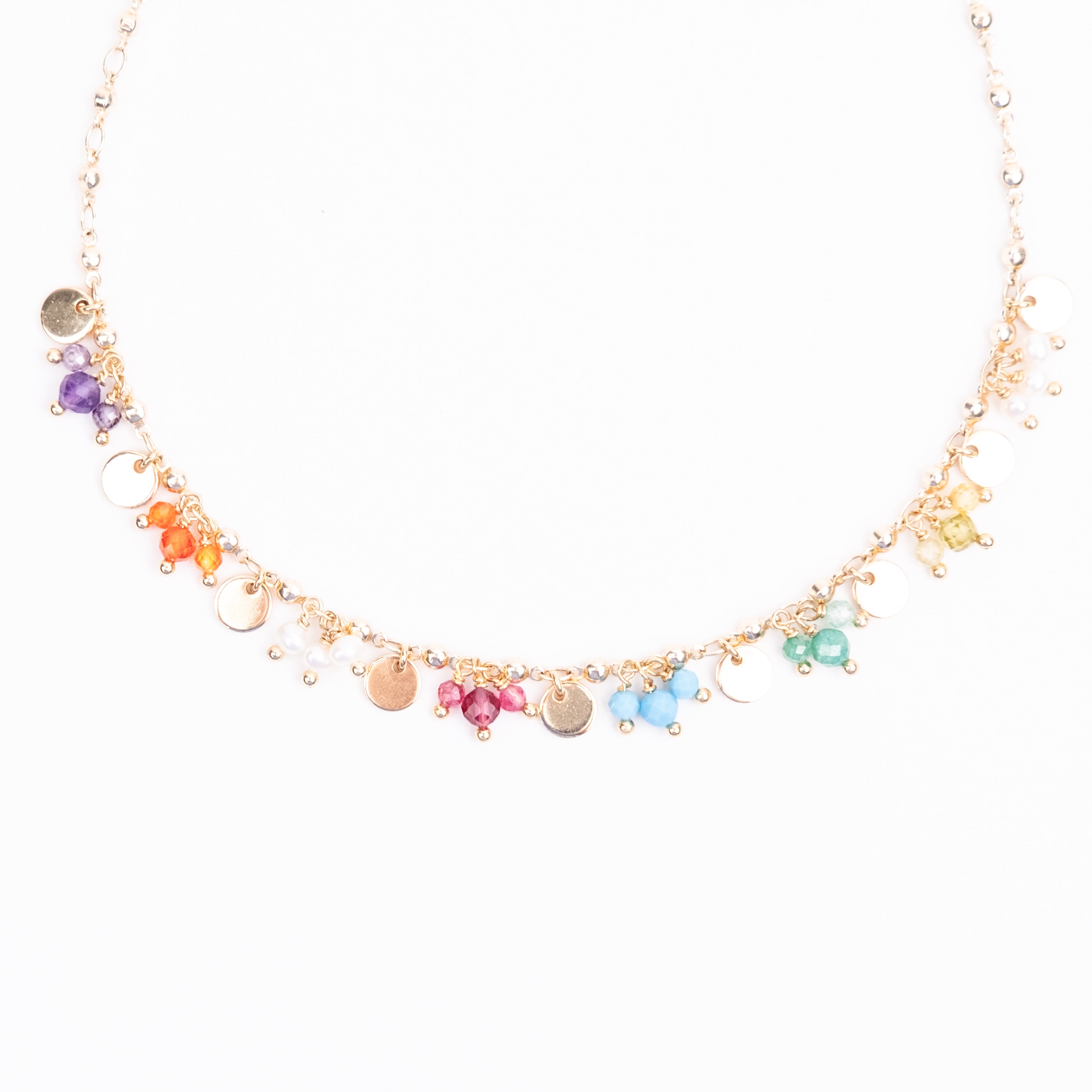 The Perfect Summer necklace. Clusters of mixed Semi Precious Stones with Gold Plated Discs.