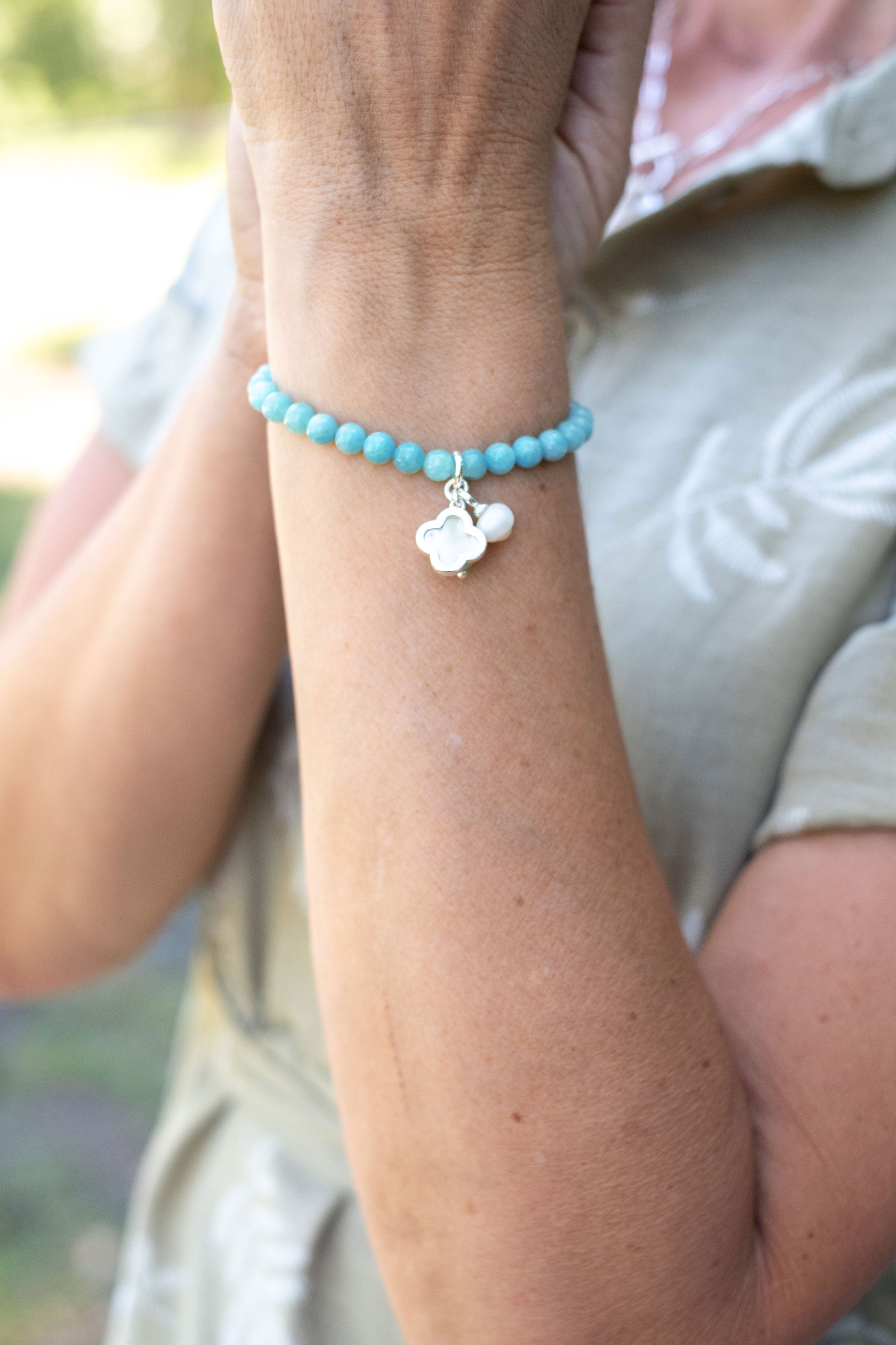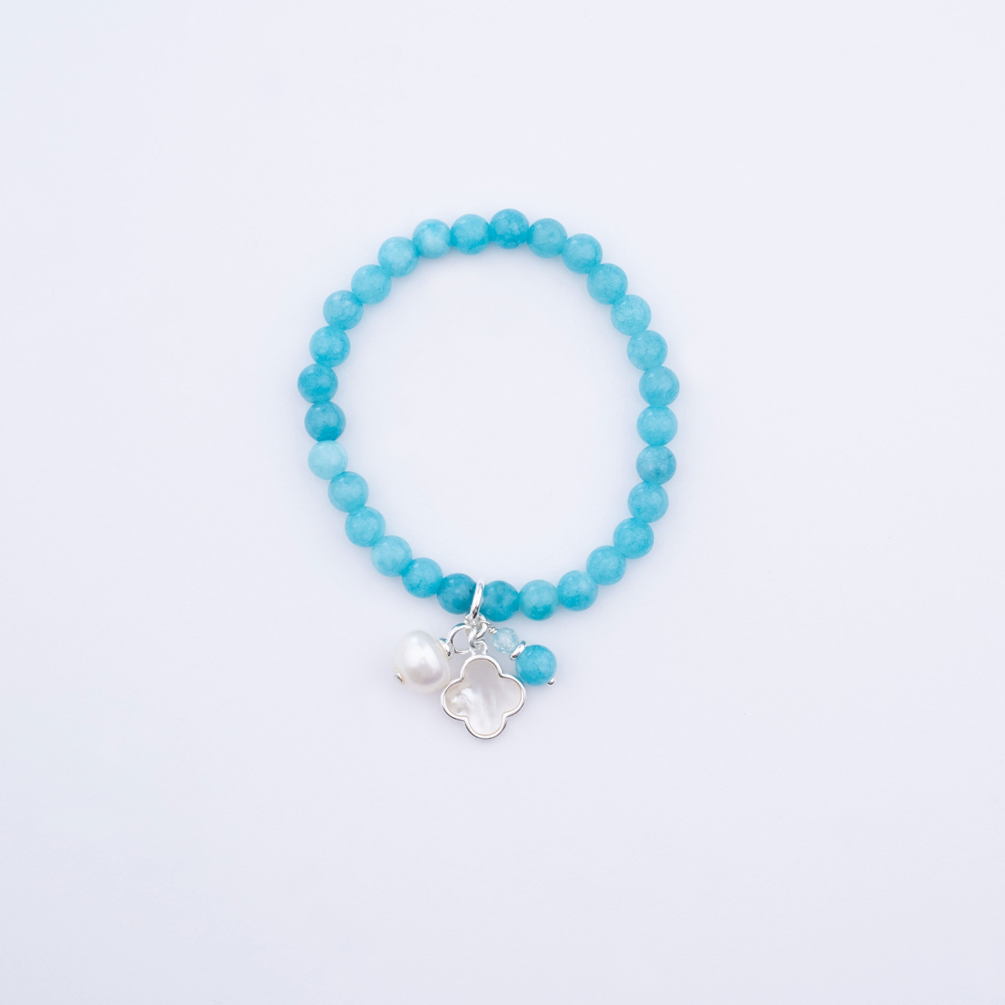 Green Agate Stretch Bracelet Finished with a Freshwater Pearl and Mother of Pearl Fleur Charm