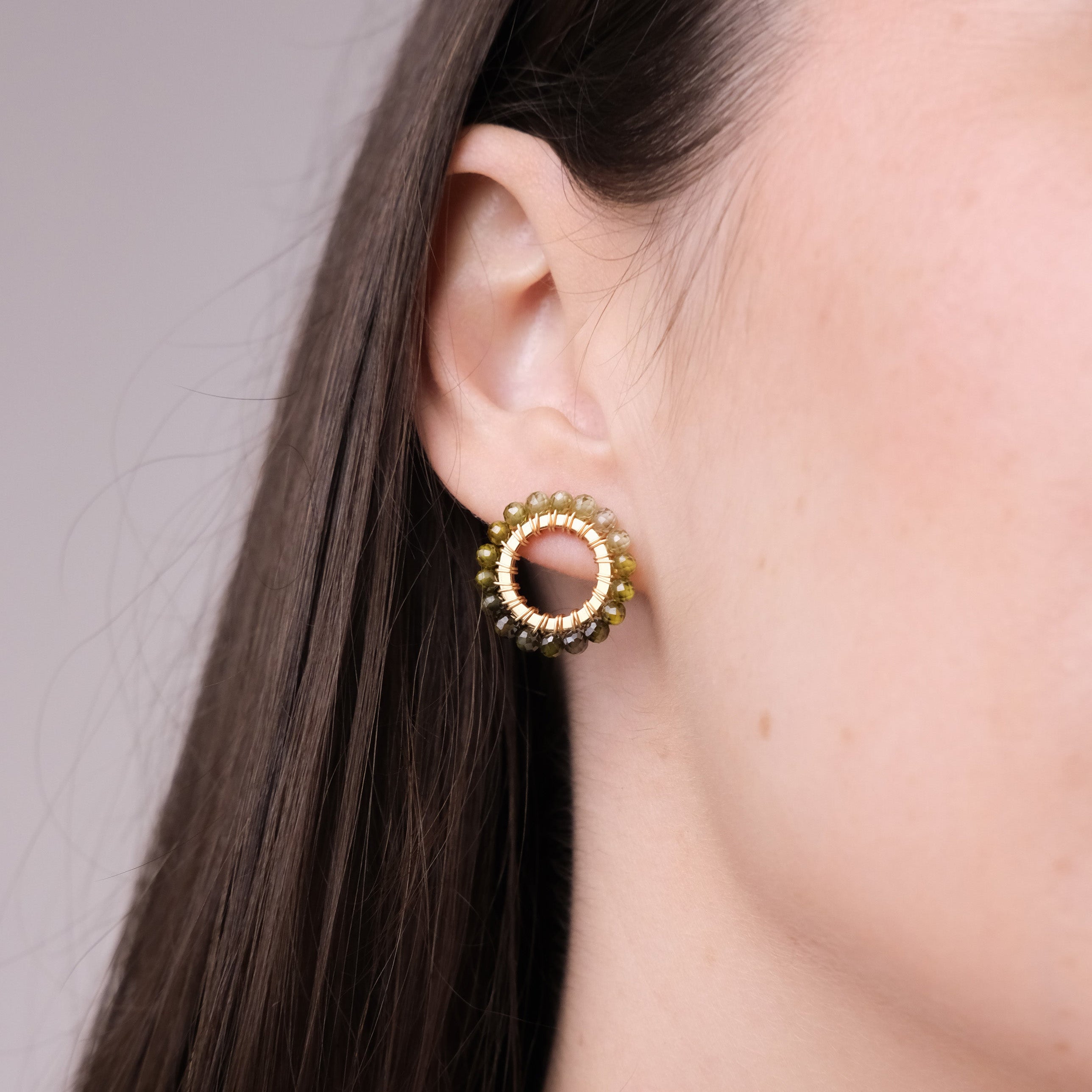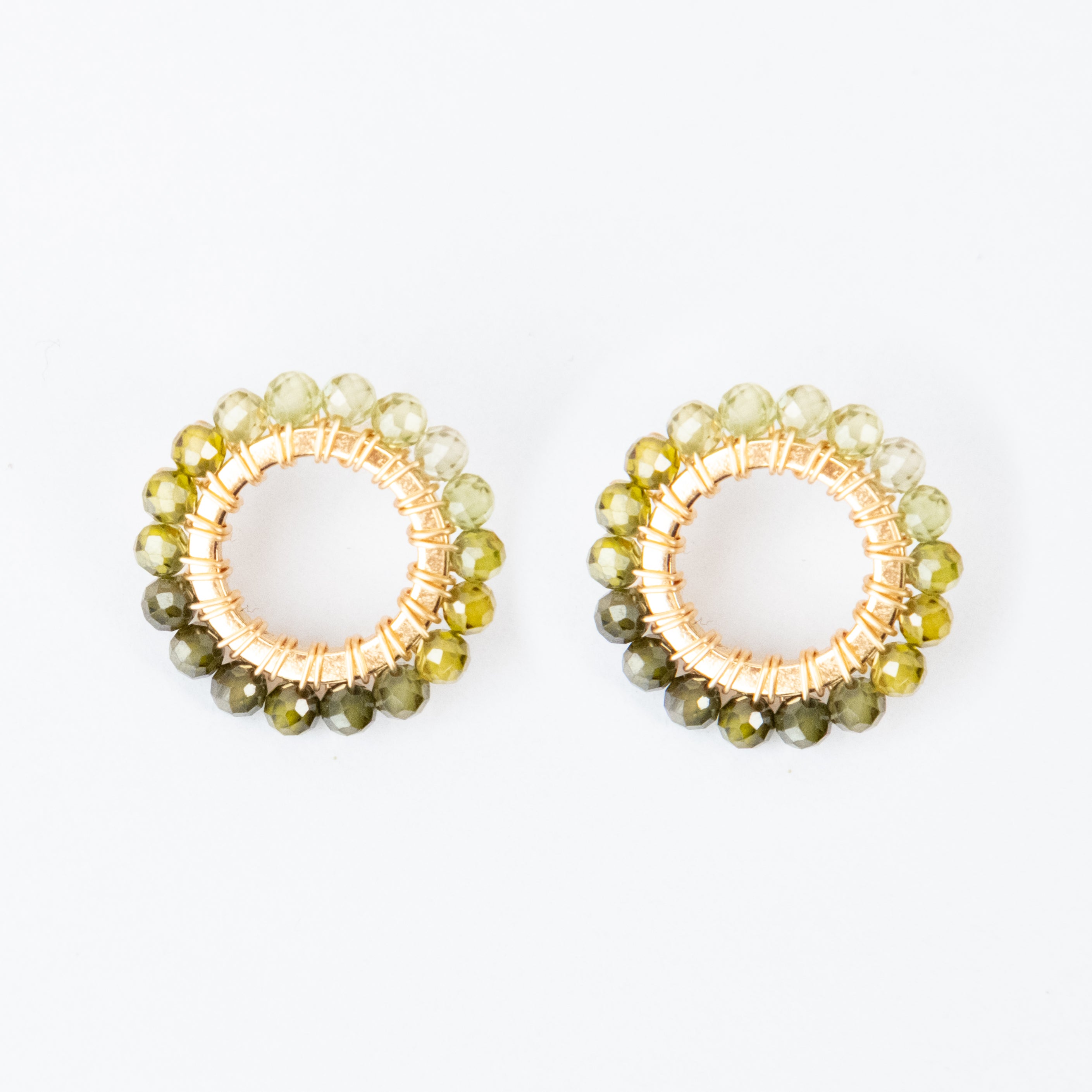 Peridot Gemstones handwoven onto Gold Plated circle studs