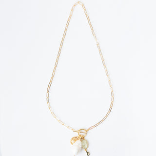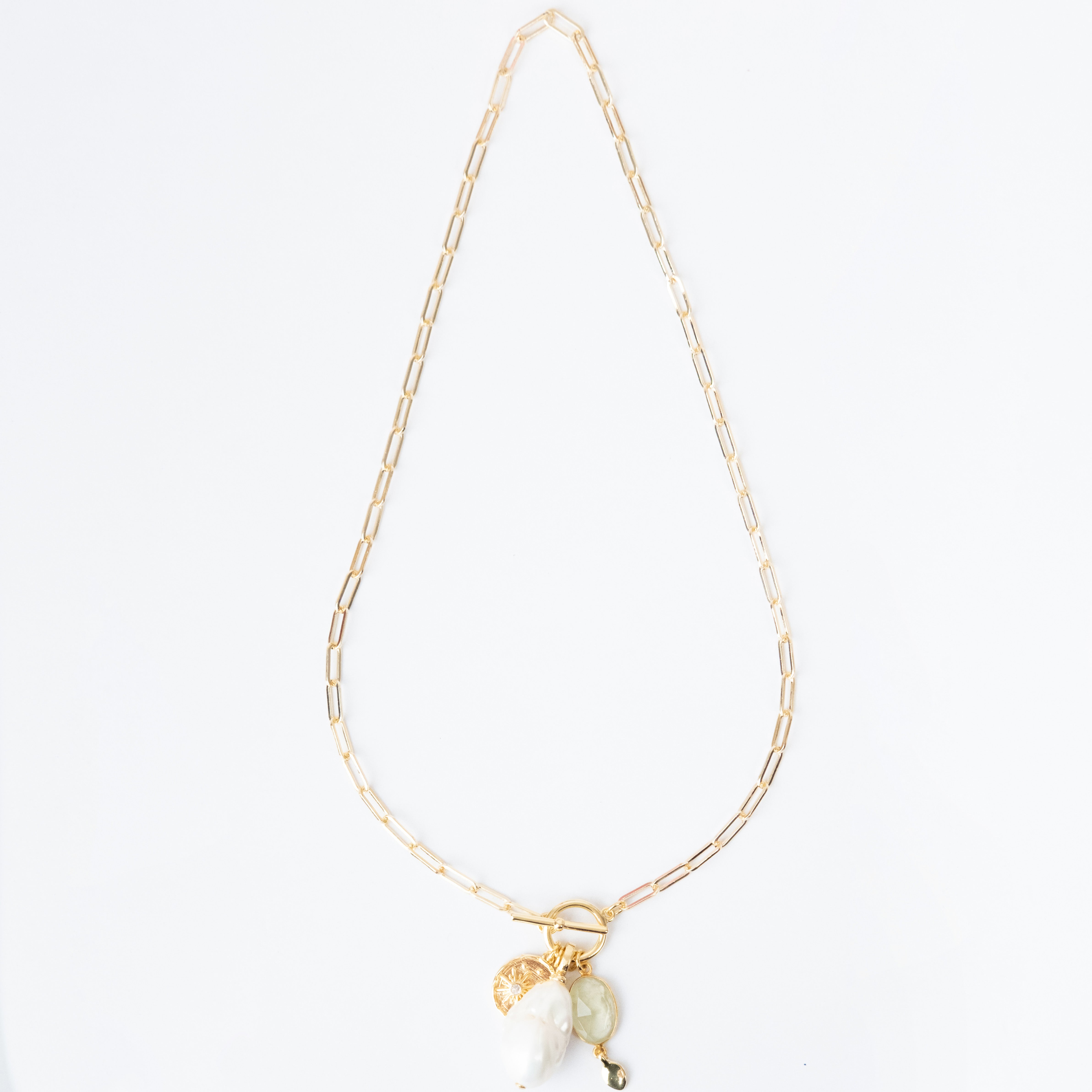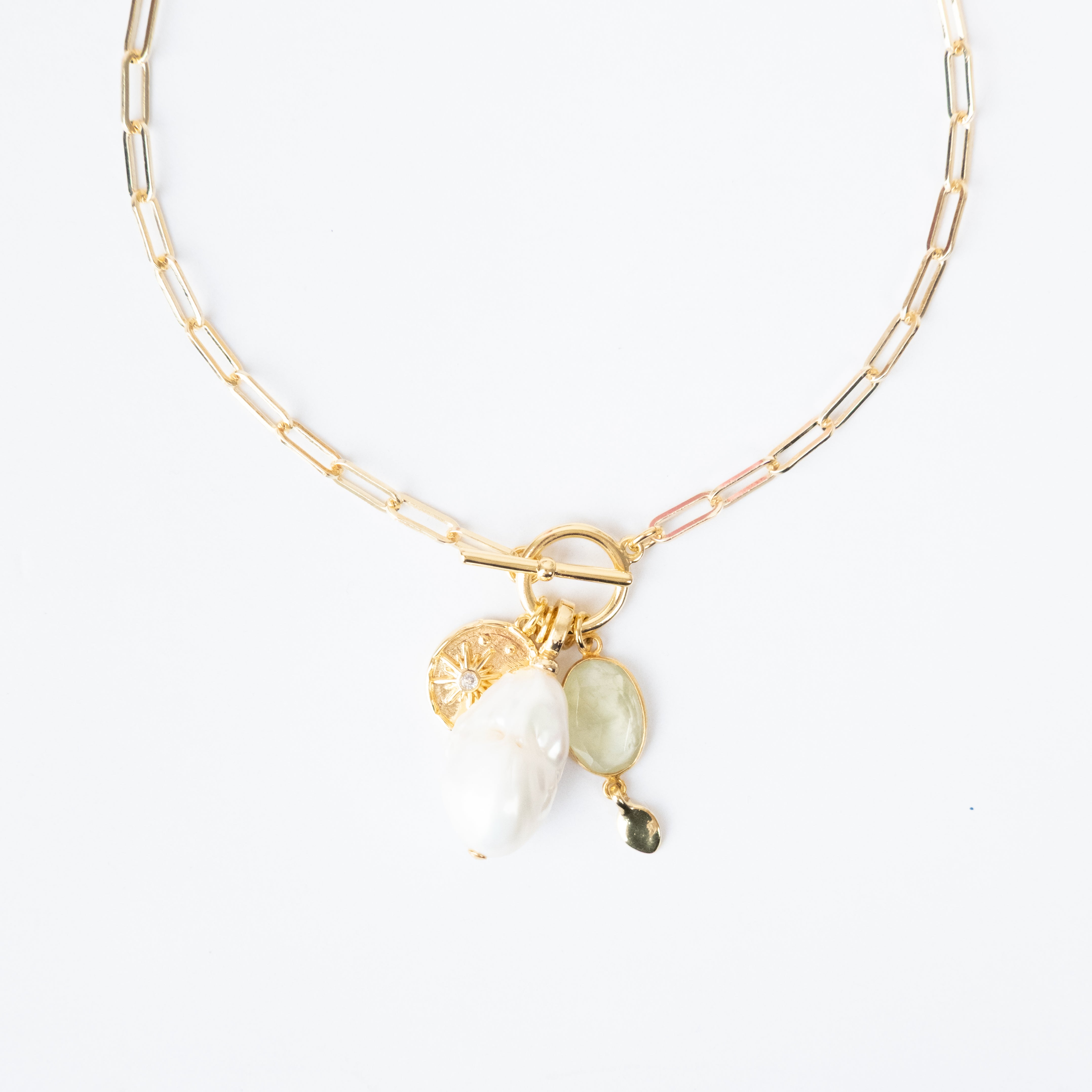 Baroque Freshwater Pearl with Phrenite Bezel Gemstone and gold plated charms on gold plated FOB chain.